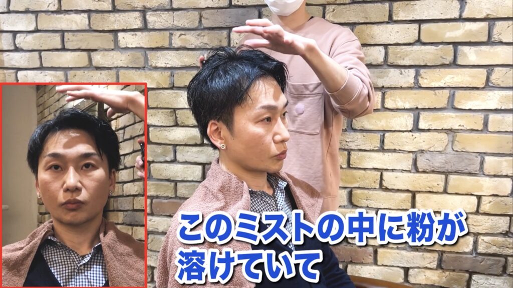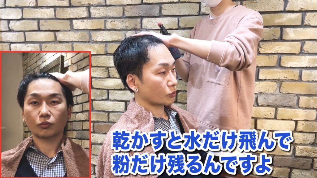 ここでのポイントは、表面だけでなく、前髪の内側や頭頂部部分の地肌にしっかり水を含ませること。