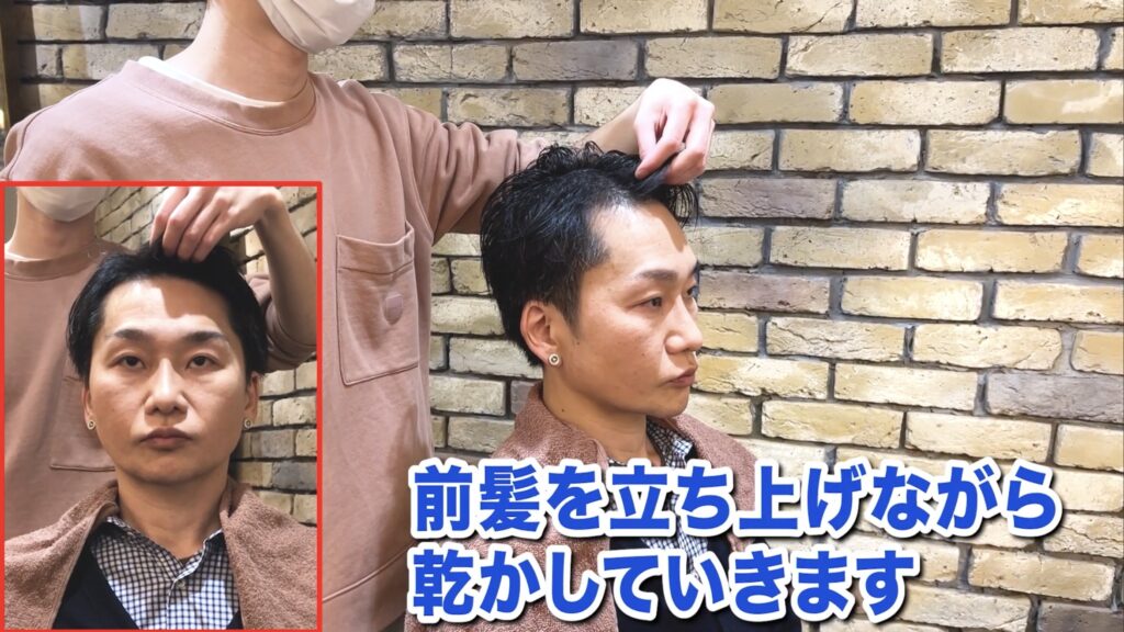 前髪の真ん中部分は落ちてきやすいので、しっかり上げるように乾かします。