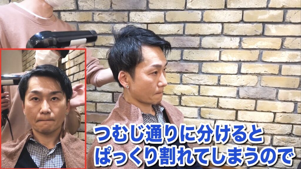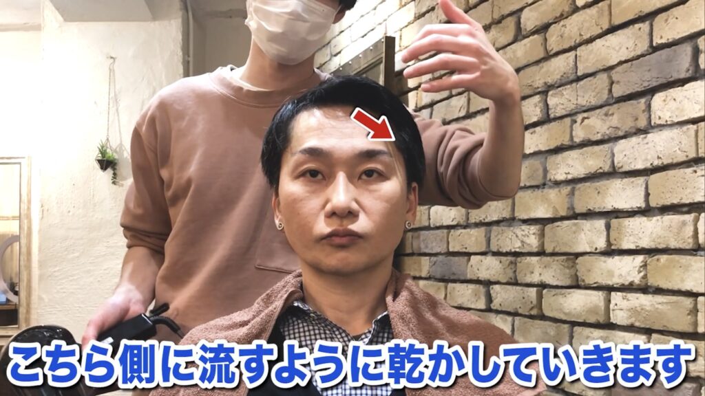 前髪の流れが右から左になっているので、頭頂部も右から左に乾かした方がバランスが良くなります。つむじ周りの髪の毛を右から左に流すように乾かすことによって、頭頂部もボリュームが出てくれます。
