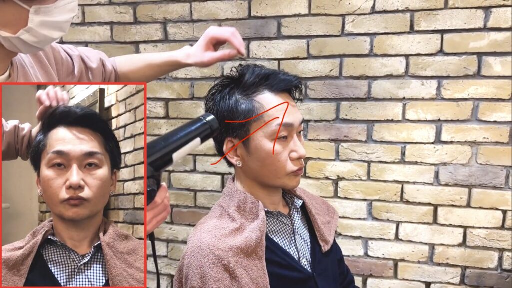 M字をカバーするために、右下から左上に前髪を上げるように乾かす