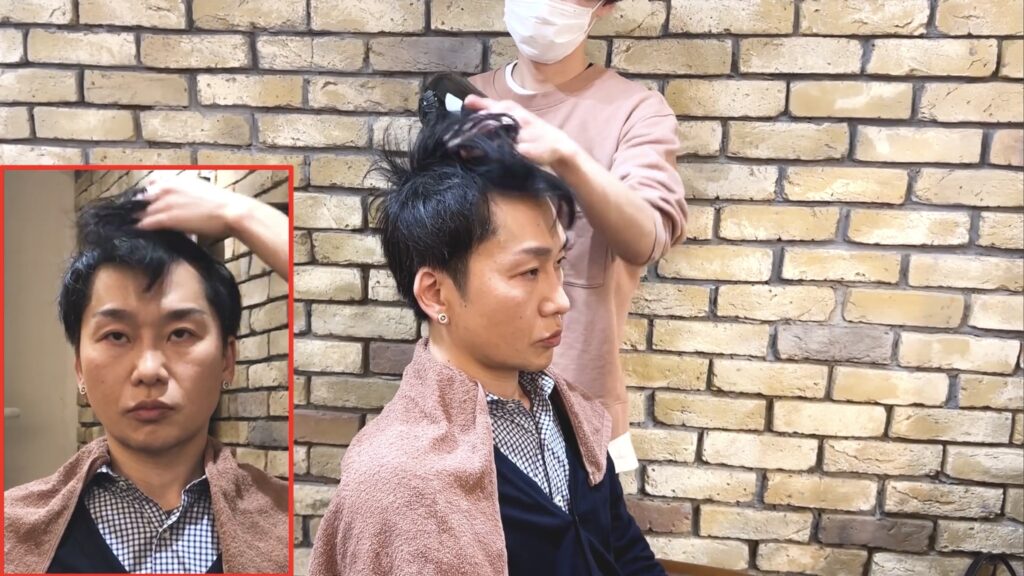 前髪は横から見たときにM字部分が透けて見えています。全体的に長い髪の毛なので、今回は短めにし、M字もカバーしつつ頭頂部にボリュームのあるようにセットしていきます。